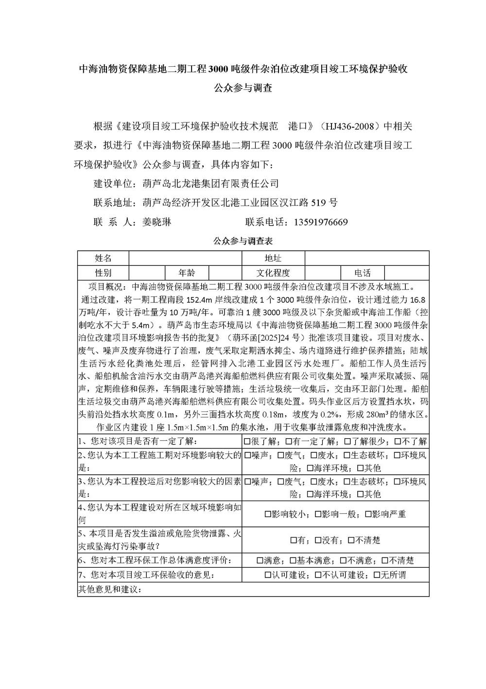 中海油物資保障基地二期工程3000噸級件雜泊位改建項目竣工環(huán)境保護(hù)驗收 公眾參與調(diào)查